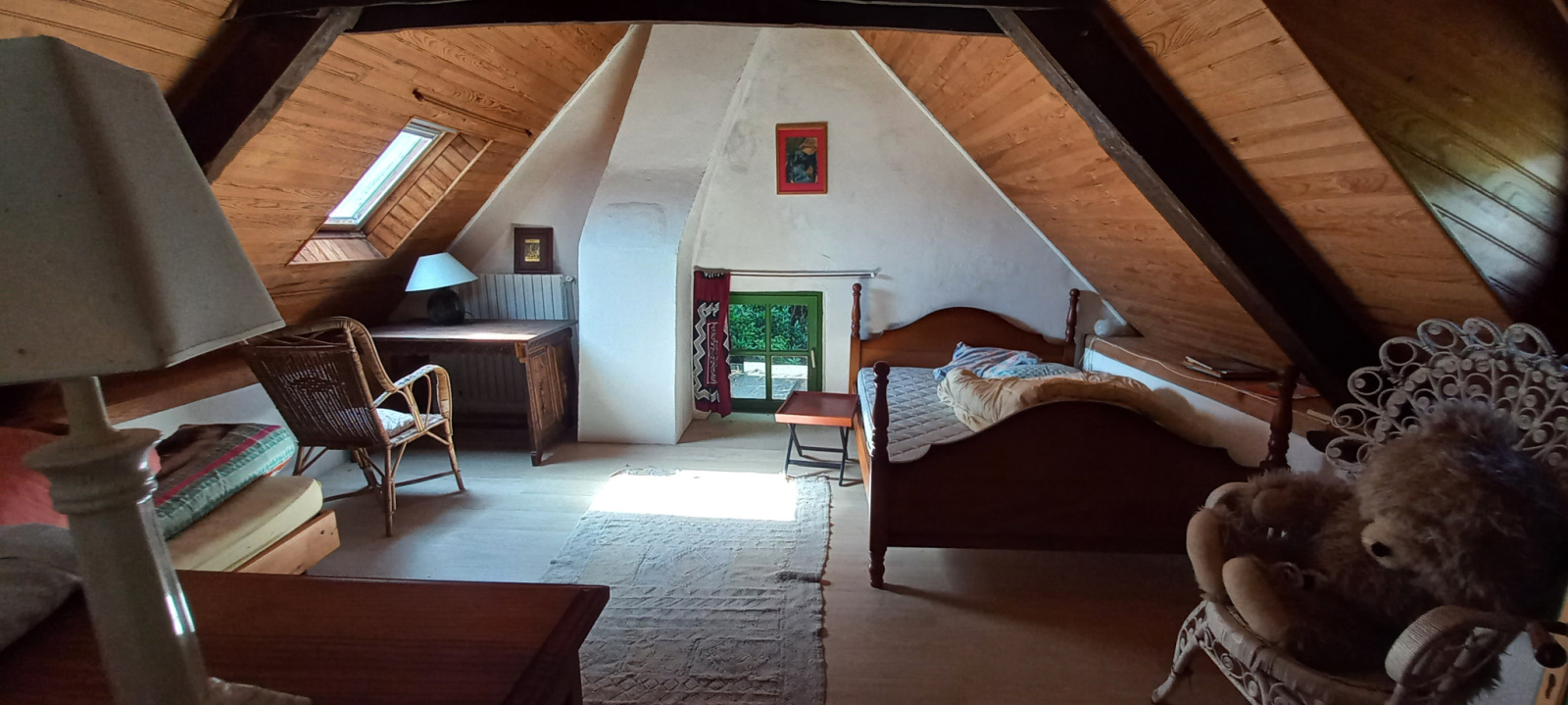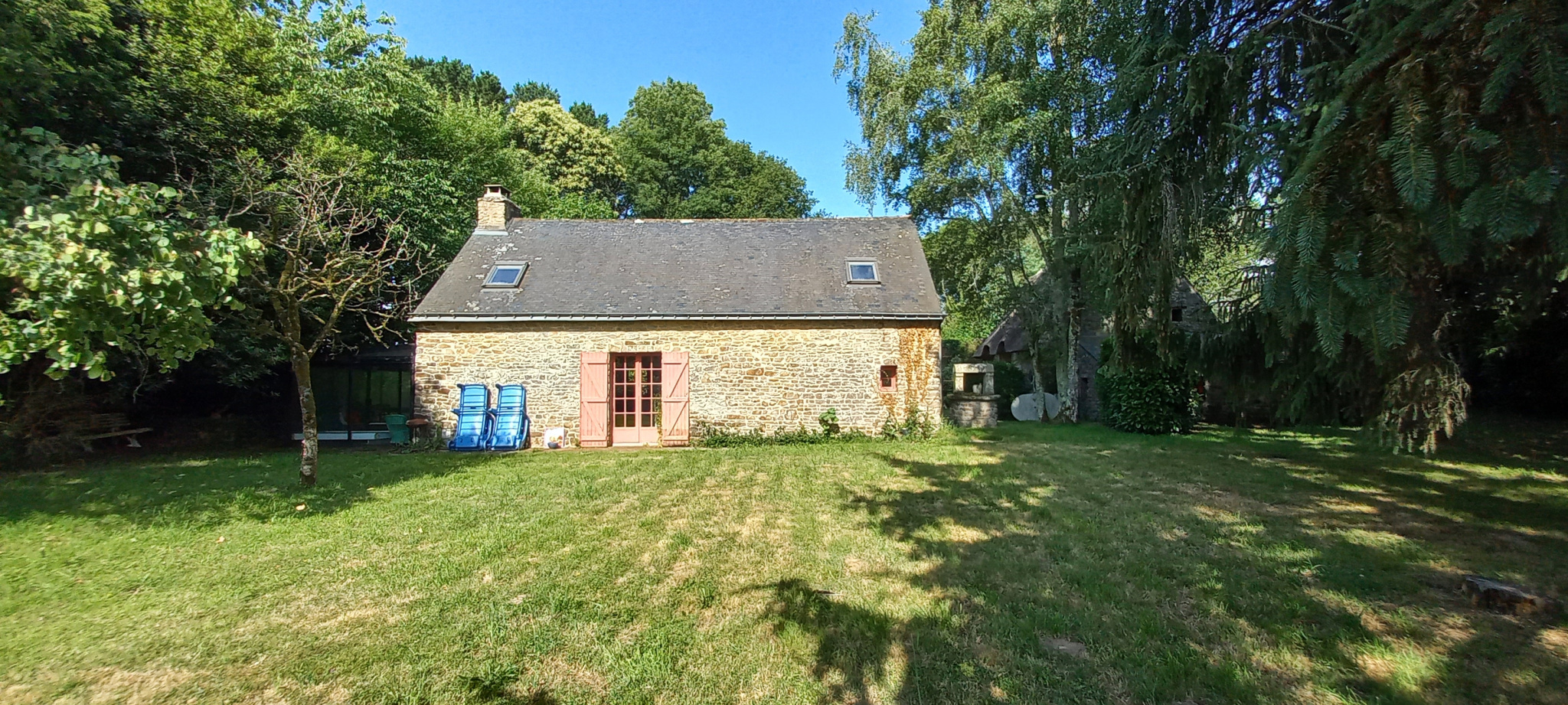 La seconde habitation, couverte d’ardoises, offre 83 m² de surface. Elle dispose d’un salon avec cheminée donnant sur une véranda, d’une cuisine indépendante, d’une salle d’eau, de deux chambres, et d’une mezzanine pouvant servir de bureau ou de couchage d’appoint.
