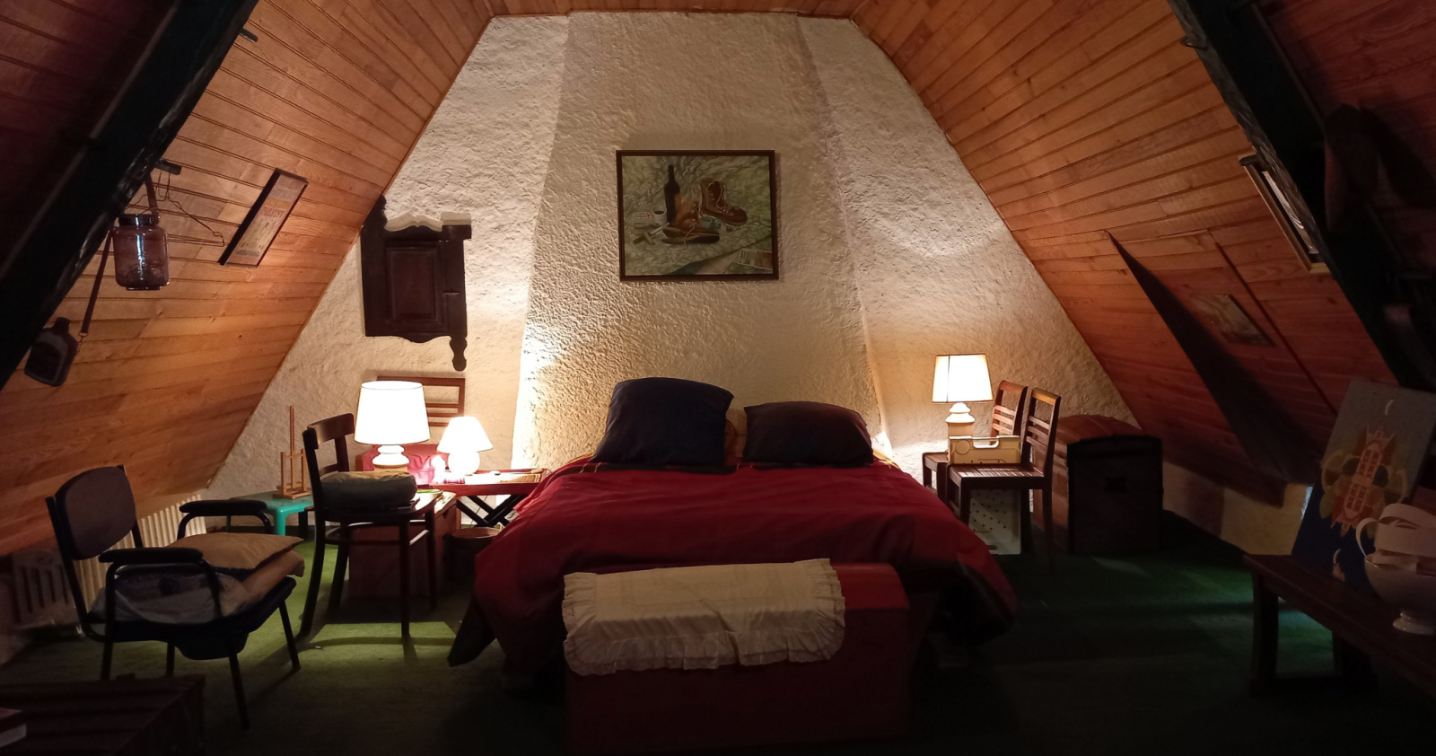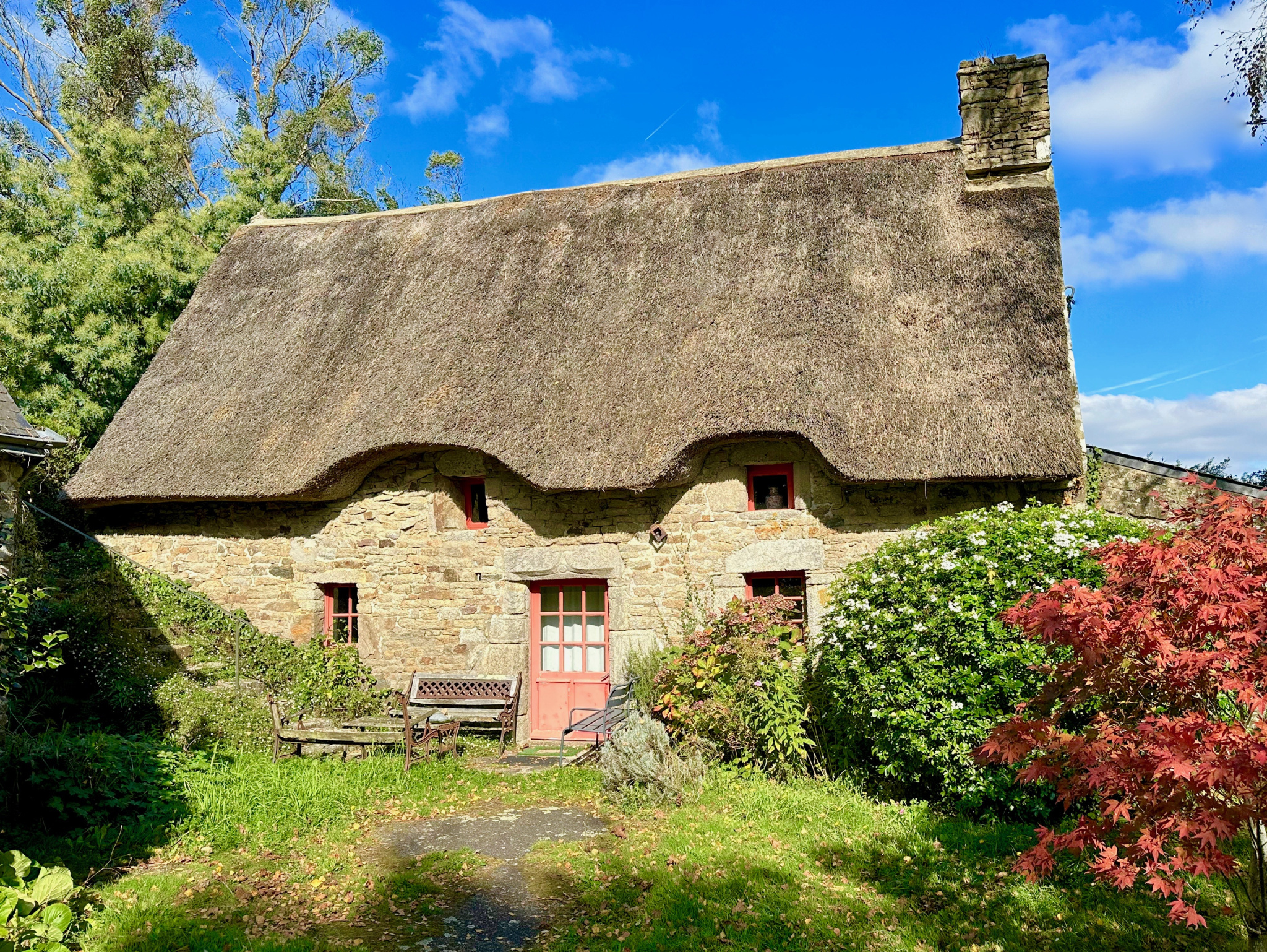 La première maison, au charme rustique d’une chaumière, développe 74 m² habitables. Elle comprend un vaste séjour avec cheminée, une cuisine ouverte, une salle de bains, des toilettes séparées, une grande chambre, ainsi qu’une cave.