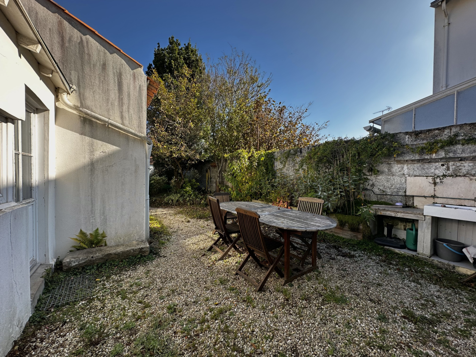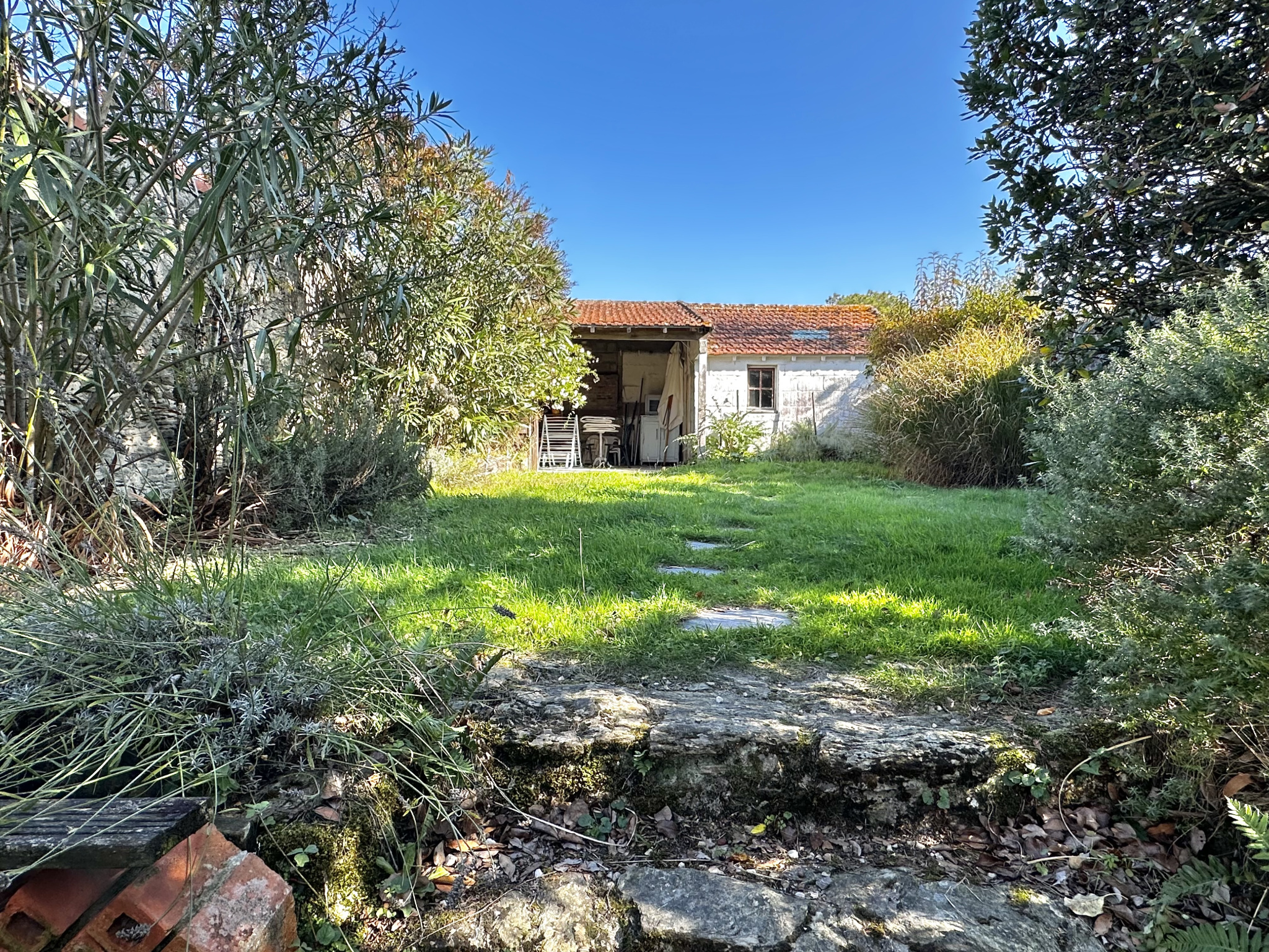 Le joli jardin de 260 m2 avec sa dépendance est clos de vieux murs et sans aucun vis-à-vis.