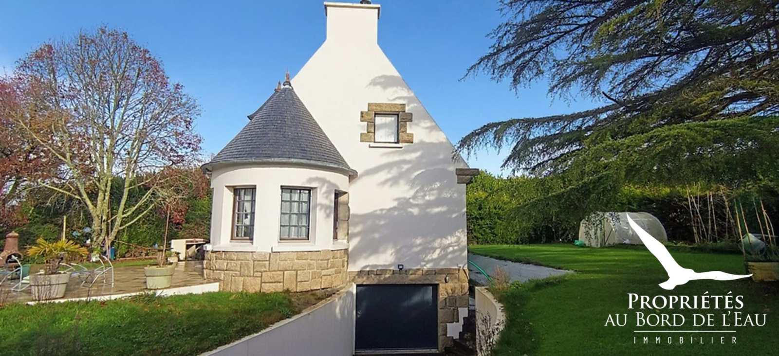 Au sein d’un hameau bordé par une rivière, cette élégante Néo-Bretonne est édifiée sur un terrain arboré de 2000 m2.