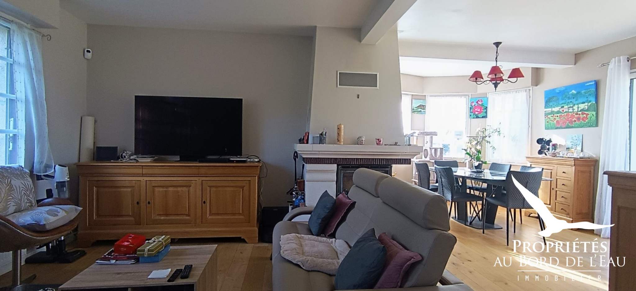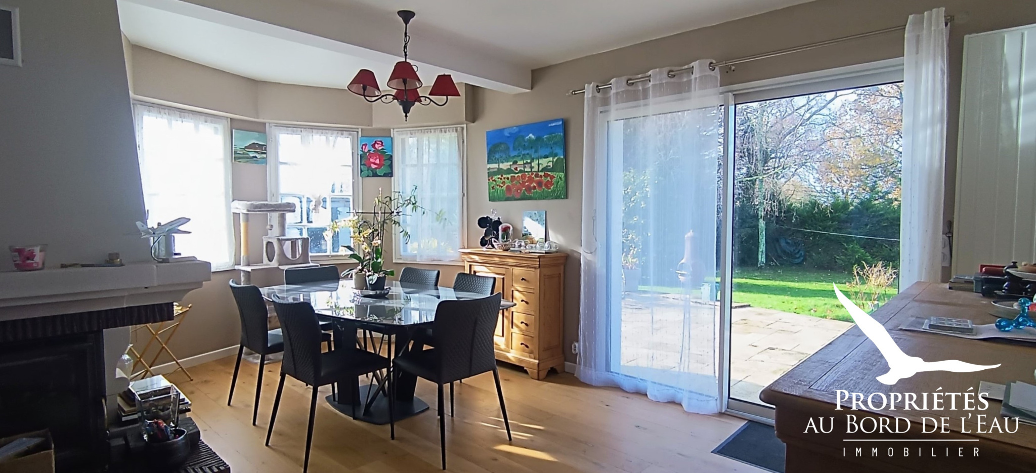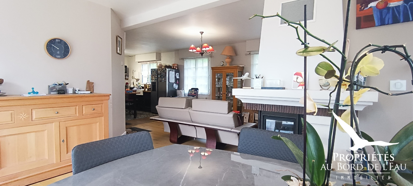La cuisine entièrement aménagée et équipée s’ouvre sur une vaste pièce de vie. Sa cheminée à insert et son bow-window baignant cette pièce de lumière allie charme et convivialité.