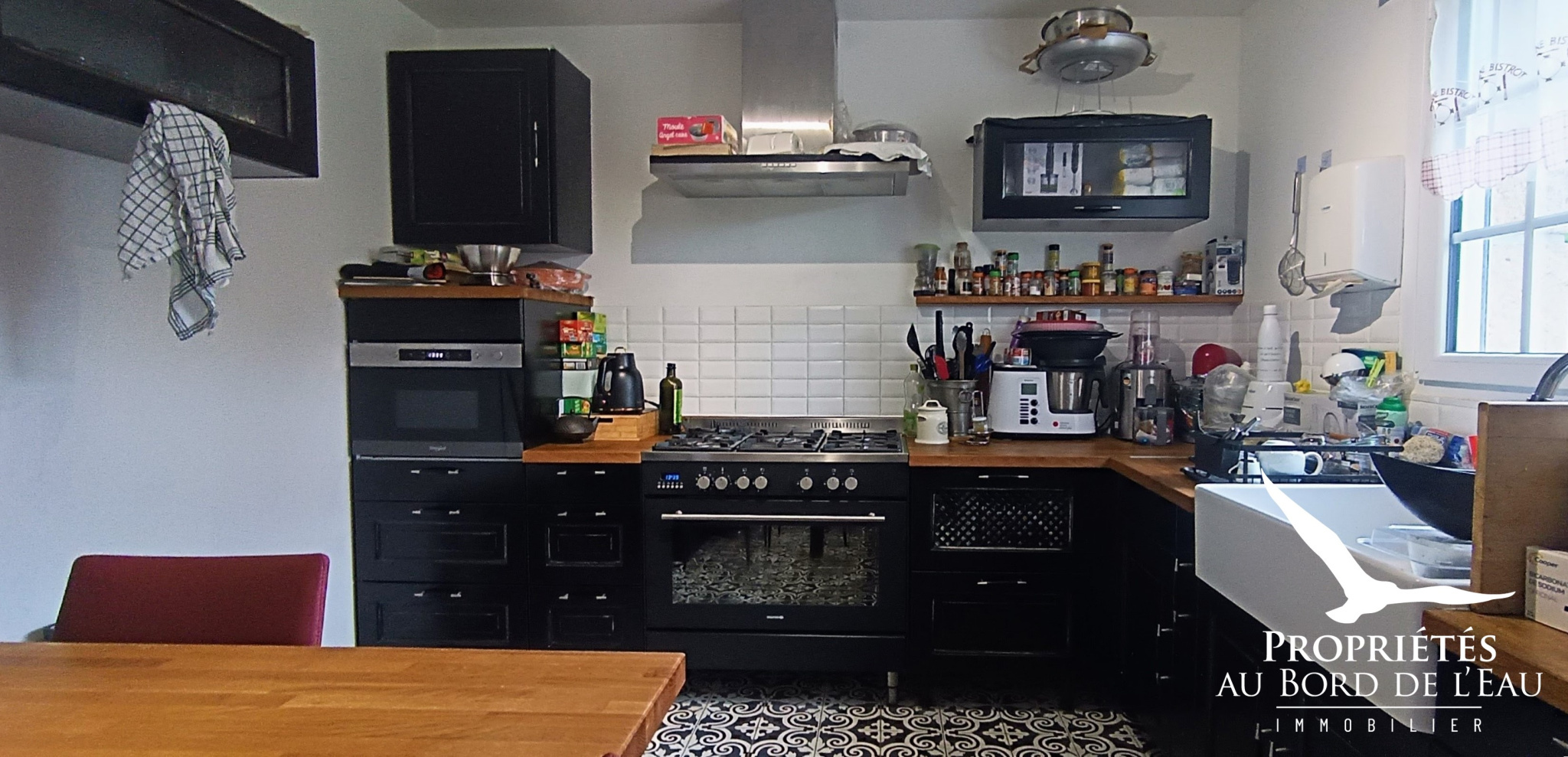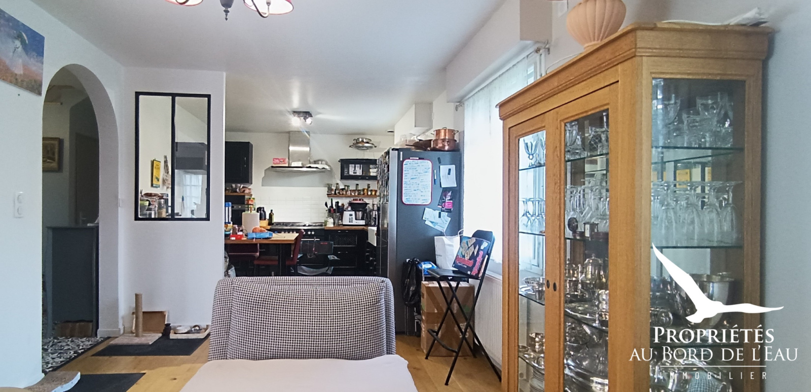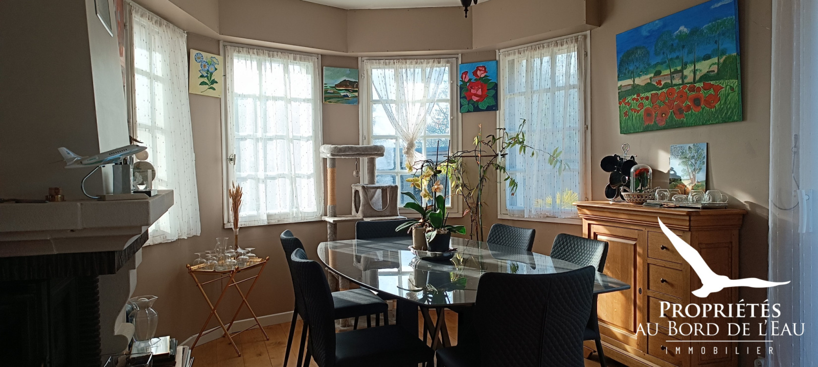 La cuisine entièrement aménagée et équipée s’ouvre sur une vaste pièce de vie. Sa cheminée à insert et son bow-window baignant cette pièce de lumière allie charme et convivialité.
